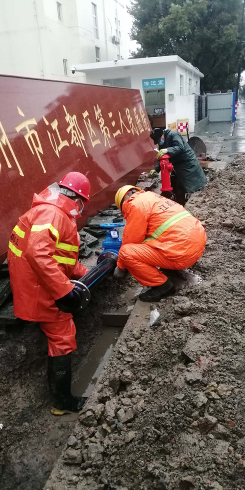 疫情就是命令,保供水就是責(zé)任。龍泉公司在接到緊急任務(wù)后,立即明確專人負(fù)責(zé),成立施工突擊隊(duì),并迅速派人赴區(qū)第三人民醫(yī)院擴(kuò)建工程現(xiàn)場(chǎng)實(shí)地查勘,向院方詳細(xì)了解擴(kuò)建工程供水需求、施工進(jìn)度安排等,并與院方共同研究,現(xiàn)場(chǎng)確定擴(kuò)建工程的接水方案。2月15日上午,搶修人員佩戴口罩、安全帽,進(jìn)行了體溫測(cè)量,冒著雨雪趕赴現(xiàn)場(chǎng),投入到緊張的施工工作中,由于前期施工方案細(xì)致、工作準(zhǔn)備充分,經(jīng)過10個(gè)小時(shí)的奮戰(zhàn),于當(dāng)天晚上8點(diǎn)順利完成了自來水管道的擴(kuò)建安裝任務(wù)。