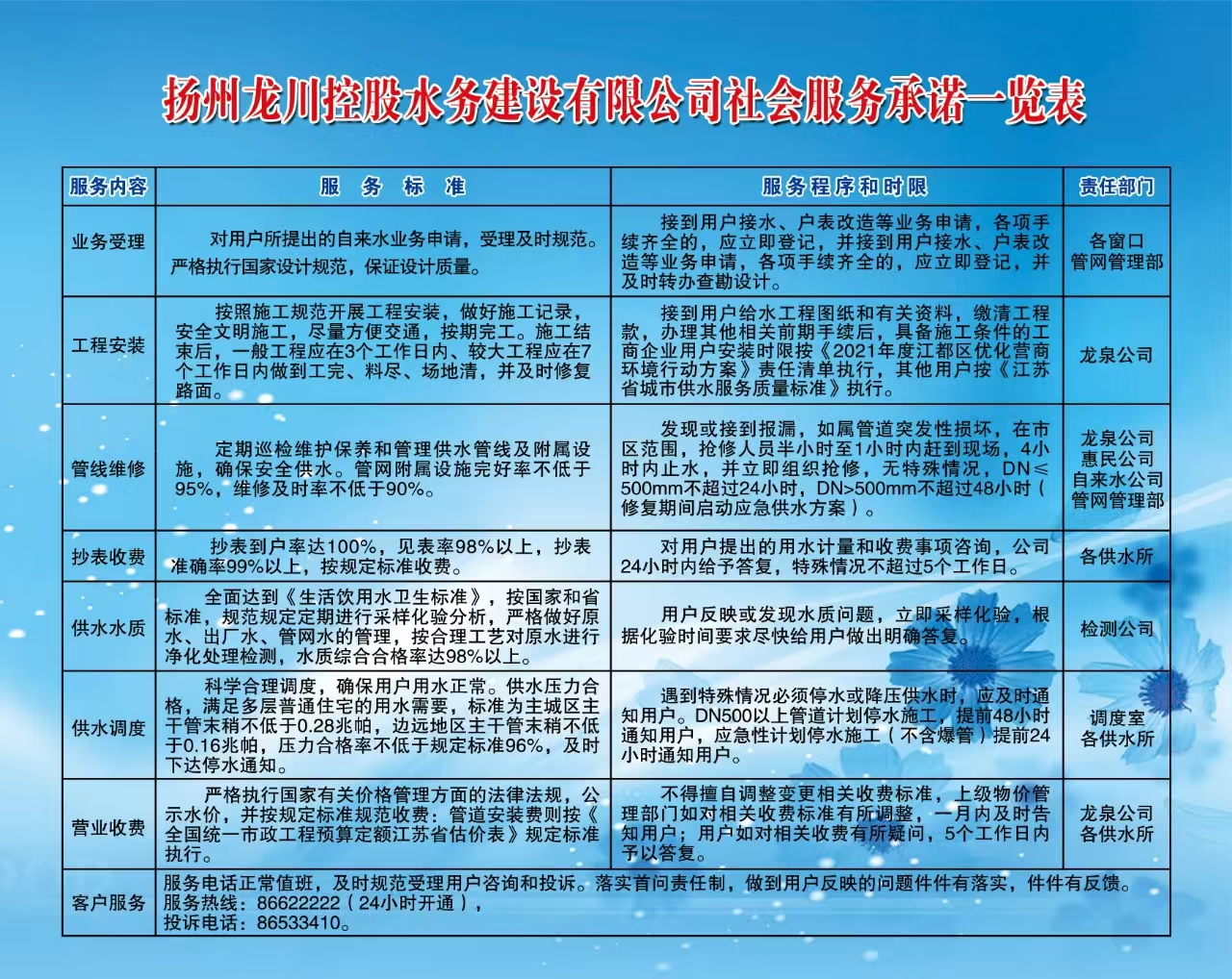 揚州龍川控股水務(wù)建設(shè)有限公司社會服務(wù)承諾一覽表
