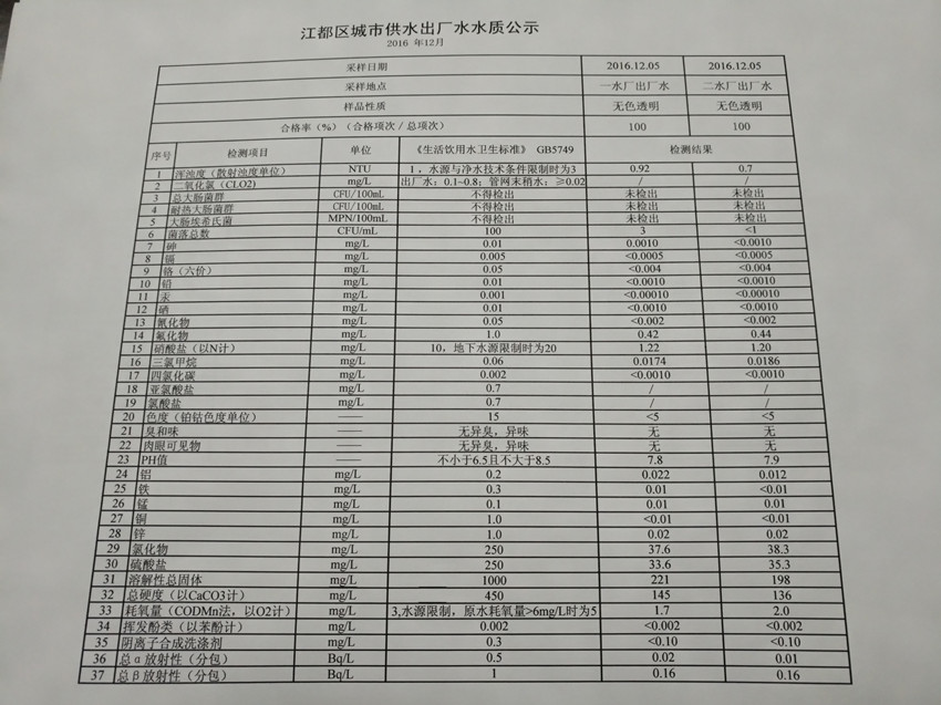 2016年12月江都區(qū)城市供水出廠水水質(zhì)公示