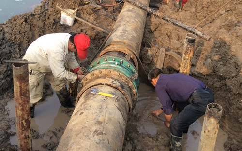 經(jīng)實(shí)地勘查,因支撐土層被挖空后塌陷,造成近60米長的DN500供水主管分節(jié)脫落,真武鎮(zhèn)油田管轄區(qū)范圍大面積停水,幾萬群眾的正常生產(chǎn)、生活用水受到影響,情況十分緊急。區(qū)自來水公司協(xié)助油田水廠根據(jù)現(xiàn)場情況,以最大程度縮短搶修時(shí)間、及早恢復(fù)供水為目標(biāo),綜合分析比對各種施工方法,科學(xué)制定了維修方案,并協(xié)助安排接水點(diǎn),供油田消防車應(yīng)急送水。經(jīng)過相關(guān)施工準(zhǔn)備后,搶修人員按照既定方案,迅速投入維修作業(yè),組織對脫落的管道進(jìn)行退拔,采用平承平插工藝對脫落的供水管道進(jìn)行重新定位、碰接。搶修人員頂著烈日連續(xù)作戰(zhàn),于下午5:00左右順利完成施工,使當(dāng)?shù)毓┧玫郊霸缁謴?fù)。