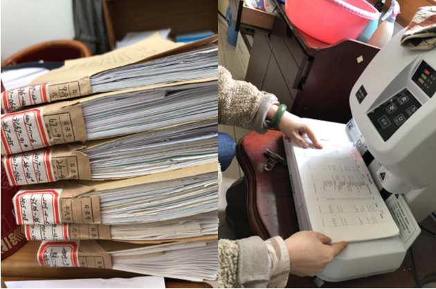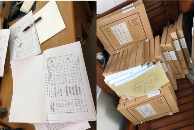 圖為財務(wù)檔案整理現(xiàn)場及其所展示的相關(guān)工作流程