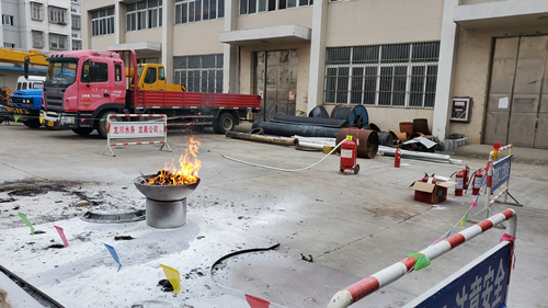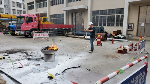 在演練前已做好前期準(zhǔn)備工作。在安全距離布置演練設(shè)圍擋、拉三角旗,畫定演練核心區(qū)域的警示線,同時(shí)在火點(diǎn)畫定安全距離園圈,保護(hù)演練人員的安全。
