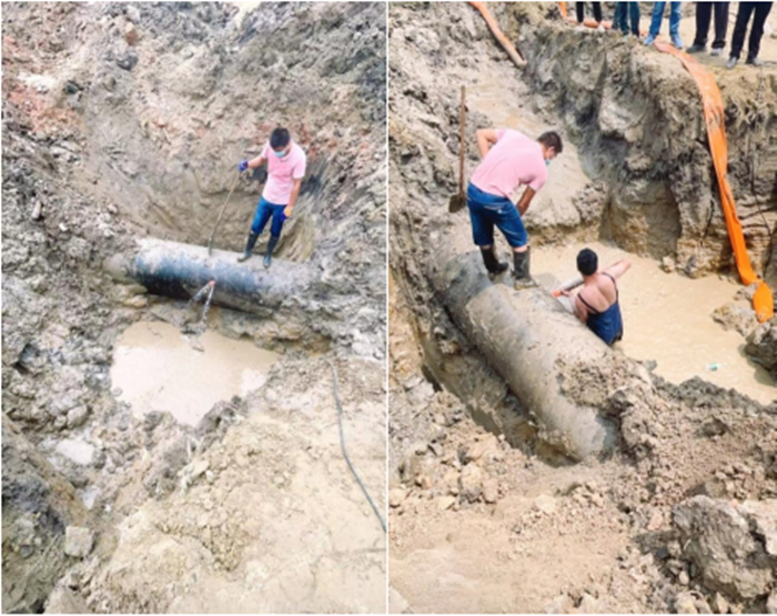 8月11日上午8時許,公司得到真武楊莊京滬高速下一處DN800球管漏水消息后,迅速組織人員趕往現場。經現場勘查,因挖機施工失誤造成管身破出一個20公分大的洞。為了防止停水造成大范圍群眾和重點單位部門用水受到影響,經驗豐富的搶修人員對此迅速做出搶修方案:關閉泵站增壓泵,低壓供水,用其木棍堵住部分余水,便于人員入坑打抱箍。經過4個多小時艱苦奮斗,于下午13點30分,供水恢復正常。