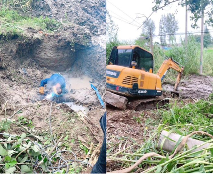 8月12日上午8時許,公司接到群眾電話稱,江都區丁伙鎮紅廟渠南路魚塘附近,有水管出現爆漏。龍泉公司項目部夏陽華經理帶領搶修人員立即到達現場核查,經查明是DN500鋼管老化裂出口子。事故點在小路半坡大樹下,靠近魚塘且土質松軟濕滑,機械施工難度較大,修復時間也較長。歷經9個小時才將漏點修復。