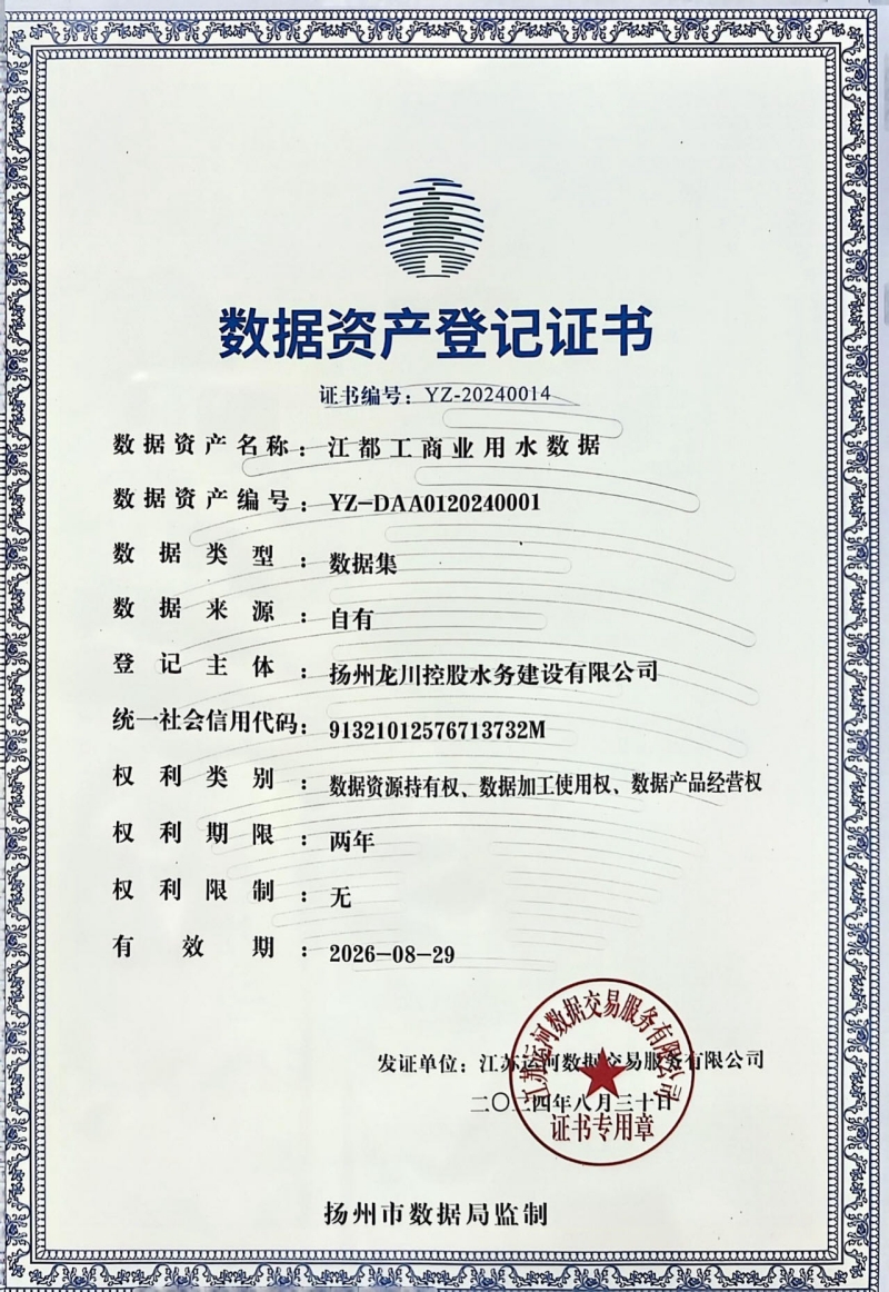 揚州龍川水務榮獲數據資產登記證書,開啟智慧水務新征程